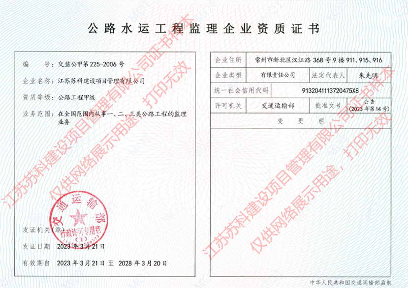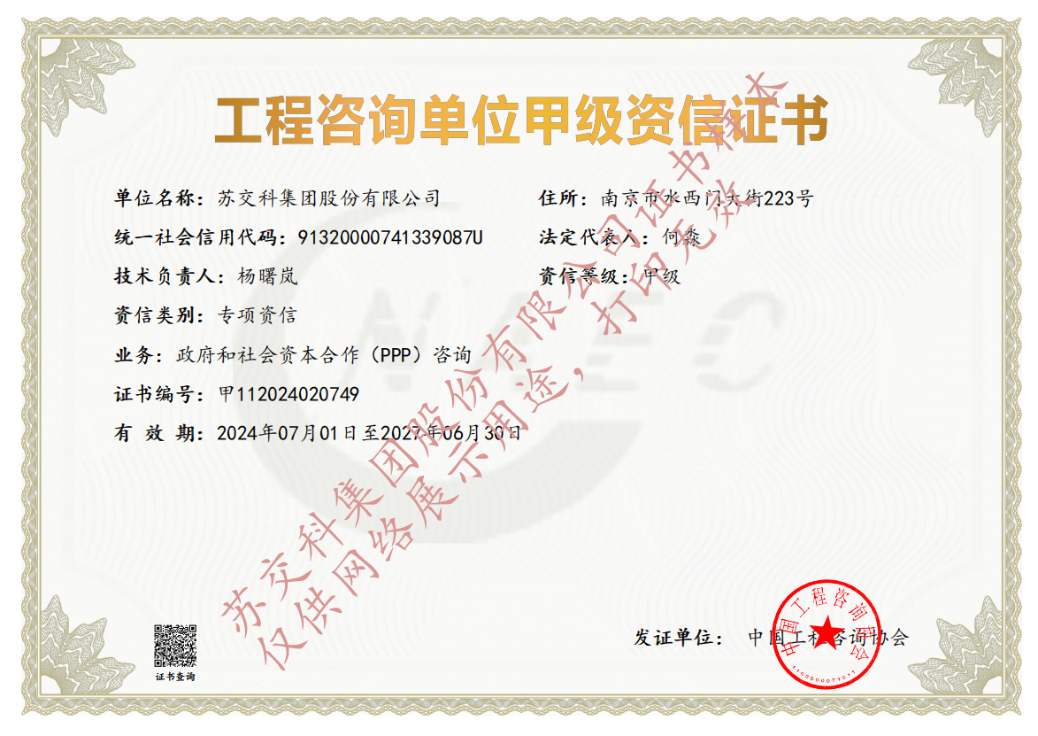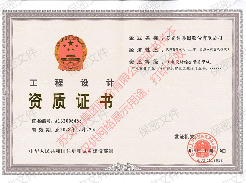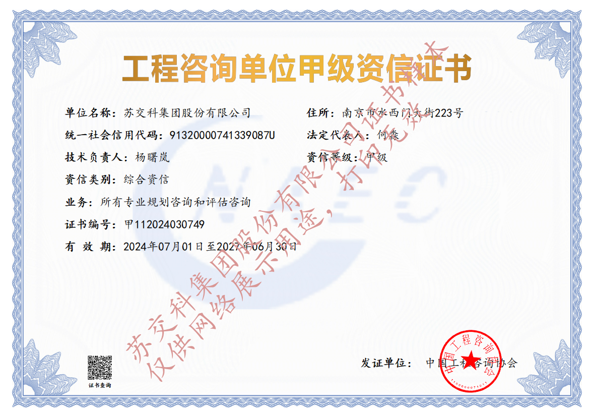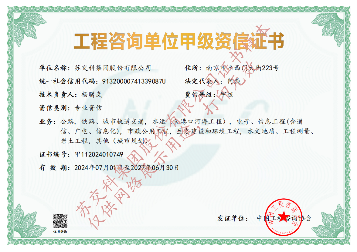 集團資質蘇交科擁有工程行業(yè)各領域甲級資質,包括城鄉(xiāng)規(guī)劃甲級資質;工程咨詢綜合甲級資質;工程咨詢專業(yè)甲級資質(公路、生態(tài)建設和環(huán)境工程、水文地質、工程測量、巖土工程、城市規(guī)劃、鐵路、城市軌道交通、港口河海工程、市政公用工程(市政交通、給排水)、水利工程、旅游工程);工程設計綜合甲級資質;工程勘察綜合類甲級資質;測繪甲級資質;公路工程和市政公用工程總承包一級資質;公路工程、水運工程、市政公用工程監(jiān)理甲級資質;公路工程甲級、公路工程交通工程專項、水運工程材料甲級和水運工程結構甲級試驗檢測資質。